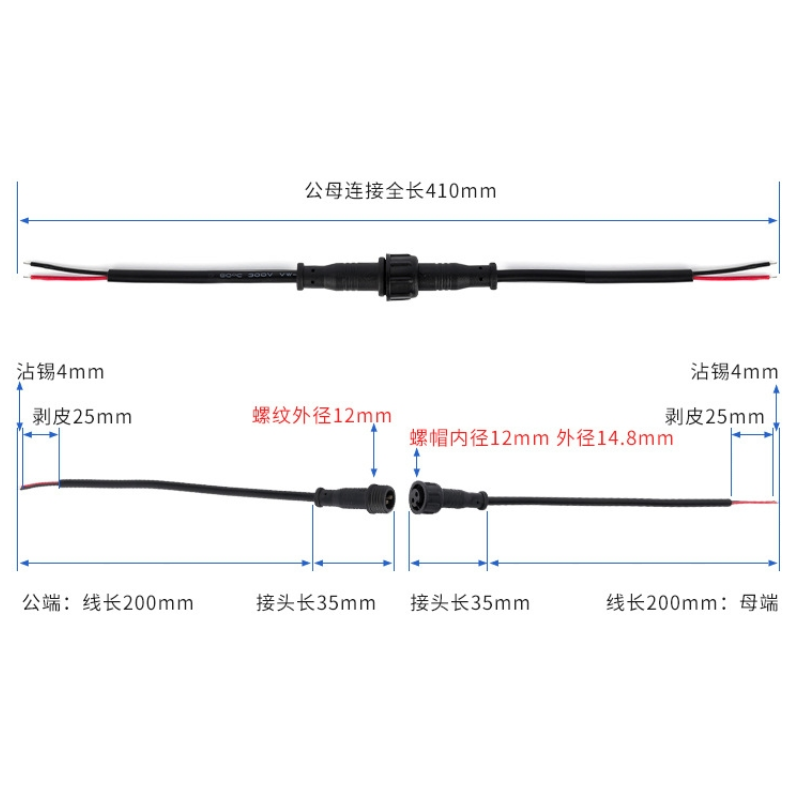 产品名称:M12-2芯 0.3平方公母LED植物生长灯防水线