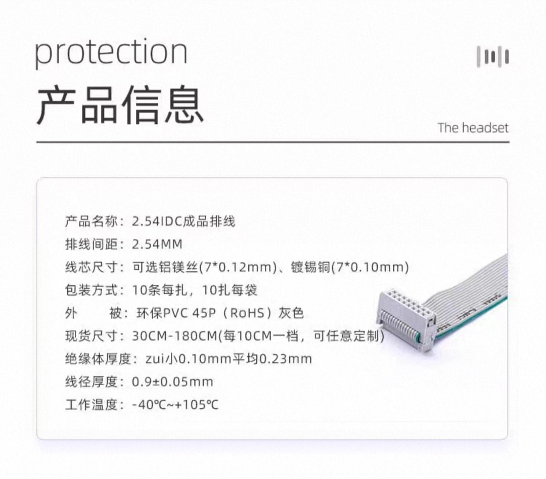 线芯尺寸:可选铝镁丝(7*0.12mm)/镀锡铜(7*0.1mm)